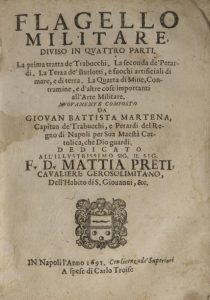 MARTENA, Giovanni Battista - Flagello Militare, diviso in quattro parti. La prima tratta de Trabucchi. La seconda de Petardi. La Terza de Burlotti, e fuochi artificiali di mare, e di terra. La quarta di mine, contramine, e d'altre cose importanti all'arte militare. Nuovamente composto. Napoli, Carlo Troise, 1691. in-4, Front., (2) ff., 211 pp., 18 pl. h. t., qqs. mouill., qqs. petites galeries de vers qui affectent qqs. lettres (p. 167 à 177), qqs. rouss., marges du front. abîmées, qqs. passages soulignés, vélin bruni de l'ép., dos un peu déf., ouvrage en partie déboîté.