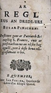 [OFFICE DE LA VIERGE MARIE] - Ar regl eus an Drede-urs eus ar pinichen. Instituet gant ar patriarch seraphic s. Frances, evit ar perfonachou eus an eil fex hag eguilé, pere à defir beva religiufamant er bet. Quimper, Jean Perier , s. d. (vers 1700) . In-12, 187 pp., (5) pp., 166 pp., (1) ff., dont une figure gravée sur bois, basane mouchetée, dos à nerfs muet.