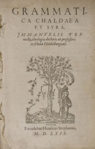 TREMELLO, Enmanuele - Grammatica chaldaea et syra. Genève, Henri Estienne, 1569. Gr. in-8, 156 pp. et (2) ff. blancs, vélin souple de l'époque.