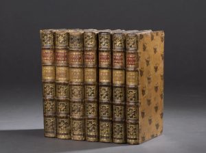 [VOLTAIRE] - Essay sur l'histoire générale, et sur les moeurs et l'esprit des nations, depuis Charlemagne jusqu'à nos jours. (Genève, Cramer), 1756. 7 vol. in-8, qqs. petites taches d'huile marginales, partie sup. de la page de garde du t. II découpée, bas. fauve mouchetée de l'ép., dos à nerfs ornés, p. de t. de mar. rouge, petit manque à la coiffe sup. du t. III