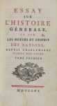 BENGESCO 1162. Édition originale de l'Essai sur les moeurs mis à part quelques chapitres ajoutés en 1761. Divers fragments en avaient été publiés depuis le Mercure en 1745 jusqu'à l'édition chez Walter à Bâle en 1754. Forme les tomes XI à XVII de l'édition collective publiée chez Cramer en 1756 comme indiqué aux faux-titres, mais vendus à part, les volumes sont tomés au dos 1 à 7.
