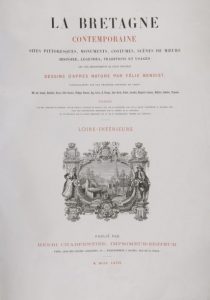 BENOIST, Félix - La Bretagne contemporaine. Sites pittoresques, monuments, costumes, scènes de moeurs, histoire, légendes, traditions et usages des cinq départements de cette province. Paris, Charpentier, 1867. 5 parties en 2 vol. in-folio, carte en coul. et 164 pl. lithog., demi-chag. brun à coins, dos à nerfs orné, un peu frotté.