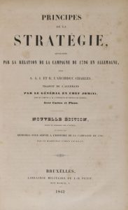 CHARLES D'AUTRICHE, Archiduc - Principes de la stratégie, développés par la relation de la campagne de 1796 en Allemagne. Traduit de l'allemand par le général en chef Jomini. Nouvelle édition revue et corrigée par l'auteur. Bruxelles, J.-B. Petit, 1842. Gr. in-8, 358 pp., 13 tabl. dépl., rouss., demi-basane prune de l'ép., dos lisse orné, dos passé et défr.