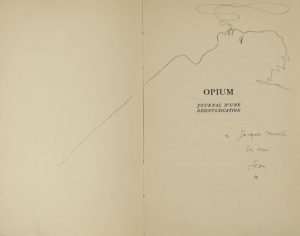 COCTEAU, Jean - Opium. Journal d'une désintoxication. Dessins de l'auteur. Paris, Libr. Stock, 1930. In-8, 264 pp., qqs. pl. h. t., br., couv. déf., dos cassé, plat sup. détaché.
