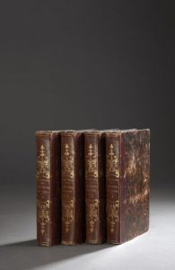 DULAURE, J. A. - Histoire des environs de Paris, comprenant la description des villes, bourgs et villages ; sites pittoresques et curiosités naturelles ; châteaux, églises, anciens couvens, etc. ; dans un rayon de 30 à 40 lieus, avec la biographie abrégée des hommes célèbres de chaque département, et le tableau de l'industrie, des usages, costumes et singularités des habitans, etc., etc. Paris, Philippe, 1837. 4 vol. in-8, 67 pl. grav. en taille douce et une carte dépl., rouss., qqs. ff. brunis, qqs. mouill. claires, demi-bas. glacée de l'ép. dos lisses ornés, qqs. coiffes lég. abîmées.