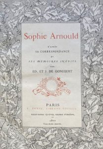 GONCOURT, Ed. et J. - Sophie Arnould, d'après sa correspondance et ses mémoires inédits. Paris, E. Dentu, 1877. In-4, portrait, 223 pp., fac-similé, texte encadré, qqs. rouss., page de garde empoussiérée, demi-mar. bleu turquoise à coins, dos lisse orné, tête dor.