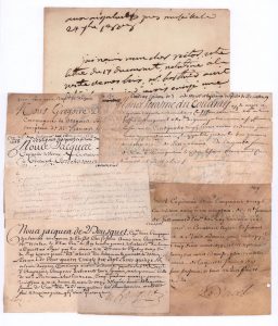 - 6 P.S. par des militaires, 1668-1679 (vélin oblong in-8 chaque), quittances par des capitaines : du Bousquet, Bricel, Brossard «dit la Perle canonnier», du Coudray, Desloges, d'Estignac ; la plupart proviennent de la collection de Villenav e qui les a annotées.