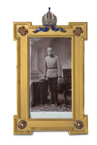 Important cadre en bronze doré à décor de frise perlée et d'émaux ; il porte dans les deux coins supérieurs le chiffre FJ en argent découpé et émaillé rouge, et dans les deux coins inférieurs deux médaillons ovales en argent ciselé des armoiries de l'Empire autrichien enrichies d'émail rouge et blanc. L'ensemble est surmonté d'une imposante couronne impériale en argent ciselé, enrichie d'émail (petits éclats à l'émail, accidents au verre).