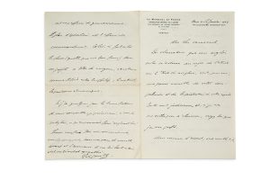 Cette cinquième vente Aristophil consacrée à l’histoire est divisée en deux parties, la première volontaire, la seconde judiciaire. À travers lettres, manuscrits et documents, mais aussi quelques livres et objets, six siècles sont ici évoqués, du XVe au XXe siècle,retraçant l’histoire de France, mais aussi celle de l’Europe, nous menant aussi en Russie (de la Tsarine Anna jusqu’à Trotski), en Amérique (avec Eisenhower, Kennedy, Bolivar et Eva Peron), en Israël avec Ben-Gurion, et jusqu’en Inde avec Gandhi.Après la Renaissance, avec François Ier et sa famille, César Borgia et Charles Quint, les Rois de France, d’Henri III à Louis XV, sont accompagnés de leurs proches et de ministres comme Richelieu et Mazarin ; on trouvera aussi une rare lettre du Masque de fer, un fragment de journal de voyage de Lapérouse, un curieux dossier sur la traite et les colonies. La Révolution est évoquée par Camille Desmoulins et le bourreau Sanson. De Napoléon, outre des bustes et statues, depuis un projet pour la défense d’Ajaccio en 1794 et une rare lettre autographe familiale, on trouvera un important ensemble de manuscrits de Sainte-Hélène destinés à ses mémoires, sur ses campagnes, sur les fortifications,et aussi des réponses aux critiques émises contre lui. L’Empire est aussi évoqué par des lettres de Joséphine (elle y annonce son prochain mariage avec le général Buonaparte), des correspondances du général Compans, du général Drouot, du soldat Robert, et un ensemble de documents du Roi George IV d’Angleterre autour du Traité de Paris et du Congrès de Vienne. Après le Second Empire, avec Napoléon III, le baron Haussmann, et une correspondance politique de Gambetta, et la guerre de 1870 avec Jules Favre, les remous révolutionnaires avec Jaurès ou Trotski, la XVIII guerre de 1914-1918 revit à travers les carnets du général Duplessis, extraordinaire reportage critique au jour le jour ; la seconde guerre mondiale est évoquée par Jean Moulin, Léon Blum, et des lettres du général de Gaulle. Enfin, mêlés à ces figures historiques, quelques écrivains apportent leur témoignage : François de Sales, La Rochefoucauld, Saint-Simon sur le mariage de Louis XV, Montesquieu, Voltaire, Sade, et d’autres, jusqu’à Jean-Paul Sartre sur la guerre d’Indochine. Thierry Bodin