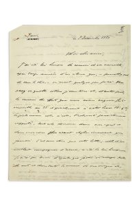 Cette cinquième vente Aristophil consacrée à l’histoire est divisée en deux parties, la première volontaire, la seconde judiciaire. À travers lettres, manuscrits et documents, mais aussi quelques livres et objets, six siècles sont ici évoqués, du XVe au XXe siècle,retraçant l’histoire de France, mais aussi celle de l’Europe, nous menant aussi en Russie (de la Tsarine Anna jusqu’à Trotski), en Amérique (avec Eisenhower, Kennedy, Bolivar et Eva Peron), en Israël avec Ben-Gurion, et jusqu’en Inde avec Gandhi.Après la Renaissance, avec François Ier et sa famille, César Borgia et Charles Quint, les Rois de France, d’Henri III à Louis XV, sont accompagnés de leurs proches et de ministres comme Richelieu et Mazarin ; on trouvera aussi une rare lettre du Masque de fer, un fragment de journal de voyage de Lapérouse, un curieux dossier sur la traite et les colonies. La Révolution est évoquée par Camille Desmoulins et le bourreau Sanson. De Napoléon, outre des bustes et statues, depuis un projet pour la défense d’Ajaccio en 1794 et une rare lettre autographe familiale, on trouvera un important ensemble de manuscrits de Sainte-Hélène destinés à ses mémoires, sur ses campagnes, sur les fortifications,et aussi des réponses aux critiques émises contre lui. L’Empire est aussi évoqué par des lettres de Joséphine (elle y annonce son prochain mariage avec le général Buonaparte), des correspondances du général Compans, du général Drouot, du soldat Robert, et un ensemble de documents du Roi George IV d’Angleterre autour du Traité de Paris et du Congrès de Vienne. Après le Second Empire, avec Napoléon III, le baron Haussmann, et une correspondance politique de Gambetta, et la guerre de 1870 avec Jules Favre, les remous révolutionnaires avec Jaurès ou Trotski, la XVIII guerre de 1914-1918 revit à travers les carnets du général Duplessis, extraordinaire reportage critique au jour le jour ; la seconde guerre mondiale est évoquée par Jean Moulin, Léon Blum, et des lettres du général de Gaulle. Enfin, mêlés à ces figures historiques, quelques écrivains apportent leur témoignage : François de Sales, La Rochefoucauld, Saint-Simon sur le mariage de Louis XV, Montesquieu, Voltaire, Sade, et d’autres, jusqu’à Jean-Paul Sartre sur la guerre d’Indochine. Thierry Bodin