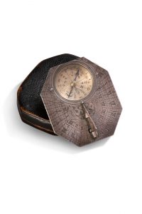 + CADRAN SOLAIRE EN ARGENT DE TYPE BUTTERFIELD (1635-1724) la platine de dorme octogonale avec une boussole, gnomon rabattable gravé d'un oiseau. — Au revers, les latitudes de 26 villes européennes. — Époque XVIlle siècle.