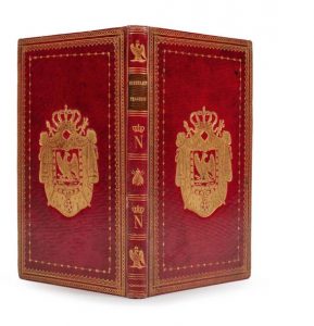 Reliure aux armes de Napoléon, le dos orné d’emblèmes impériaux, abeilles et monogramme.