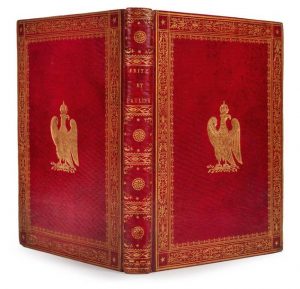 Reliure aux armes impériales, sans doute celles de l’École militaire impériale. Après un séjour à Versailles, à leur retour Napoléon et Joséphine s’arrêtèrent à l’école militaire de Saint-Cyr le 23 juillet 1811 pour assister à la représentation de ce petit opéra-comique que les élèves avaient organisée pour eux.
