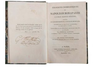 Chagrins domestiques de Napoléon Bonaparte à l’isle Sainte-Hélène ; précédé de faits historiques de la plus haute importance, le tout de la main de Napoléon ou écrit sous sa dictée. Papiers enlevés de son Cabinet dans la nuit du 4 au 5 mai 1821 et publiés par Edwige Santiné, ex-huissier du cabinet de Napoléon Bonaparte à Sainte-Hélène, suivi de notes précieuses sur les six derniers mois de la vie de Napoléon. Paris, Germain Mathiot, septembre 1821. In-8, demi-cuir de Russie vert avec coins, dos lisse fileté or, tranches jaunes (Reliure de l’époque).