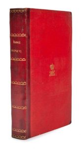 Éloge de Pie VI, avec l’Histoire religieuse de l’Europe sous son pontificat, accompagné de pièces officielles et de documens authentiques. Paris, Arthus Bertrand, 1825. In-8, demi-cuir de Russie rouge avec coins, chiffre couronné au centre, dos lisse orné (Reliure de l’époque).
