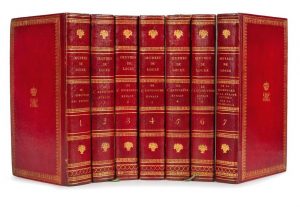 Œuvres philosophiques. Nouvelle édition, revue par M. Thurot. Paris, Bossange, De l’Imprimerie de Firmin-Didot, 1821-1825. 7 volumes in-8, maroquin rouge, bordure ornée d’une roulette, chiffre couronné au centre, dos lisse orné d’une composition florale, roulette annelée intérieure, doublure et gardes de moire bleue, tranches dorées (Reliure de l’époque).