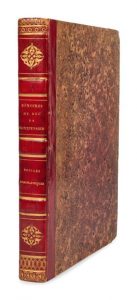 Exemplaire élégamment relié, provenant de la bibliothèque du roi Louis-Philippe au Palais-Royal, avec son cachet sur le titre (II, 1852, n°2002). Il est enrichi de 3 planches gravées et aquarellées à l’époque d’après des dessins originaux exécutés par le duc de Montpensier durant sa captivité. Rousseurs, charnière supérieure un peu marquée.