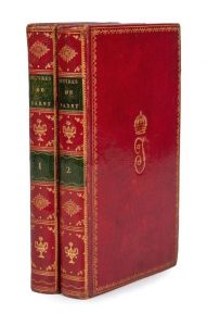 Œuvres diverses. Paris Debray, 1802. 2 volumes in-12, maroquin rouge, bordure ornée d’une roulette, chiffre couronné, dos lisse orné, pièces de titre et de tomaison vertes, roulette intérieure, doublure et gardes de soie verte, tranches dorées (Reliure de l’époque).