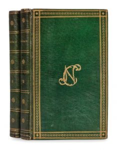 Belle reliure de l’époque au chiffre présumé de Napoléon Bonaparte, Premier consul. Sur les gardes, l’ingénieur écossais James Nasmyth a rédigé en anglais l’histoire de ces volumes, dérobés en 1815, après la bataille de Waterloo, dans la bibliothèque de la Malmaison, demeure de Joséphine, par un capitaine de régiment des Horse Guards nommé G. de Villiers. Celui-ci, marié à une des filles de la famille Nasmyth, l’offrit à Alexandre, père du signataire de cette note.