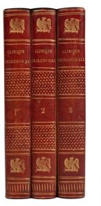 Clinique chirurgicale, ou Mémoires et observations de chirurgie clinique, et sur d’autres objets relatifs à l’art de guérir. Paris, J. G. Dentu, 1810. 3 volumes in-8, maroquin rouge à long grain, filet et roulette en encadrement, armoiries au centre, dos lisse orné de petits fers à l’étoile, pièces d’armoiries et filets dorés, roulette intérieure et sur les coupes, doublure et gardes de tabis bleu, tranches dorées, étui moderne (Reliure de l’époque).