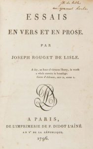 Édition originale de ce recueil dédié au compositeur Méhul, contenant notamment La Marseillaise, présentée sous ce titre : Le Chant des combats, vulgairement L’Hymne des Marseillois. La Marseillaise, devenue hymne national par décret du 14 juillet 1795, parut pour la première fois en volume dans cette édition de 1796, après son insertion dans l’Almanach des muses en 1793. L’édition est illustrée d’une planche gravée par Gaucher d’après Le Barbier et comprend 4 pages de musique : Chant de l’hymne à l’espérance.