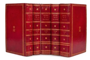 Œuvres. Nouvelle édition ; avec un commentaire historique et littéraire, précédé d’un nouvel essai sur la vie et les écrits de l’auteur. Paris, Lefèvre, 1820. 5 volumes in-8, maroquin rouge à long grain, encadrement de filets et roulette feuillagée, chiffre couronné au centre, dos lisse orné, roulette intérieure, doublure et gardes de moire bleue, tranches dorées (Reliure de l’époque).