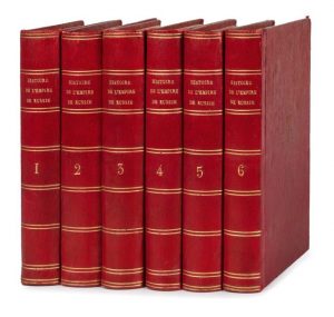 Histoire de l’empire de Russie, sous le règne de Catherine II, et à la fin du dix-huitième siècle. Paris, De l’Imprimerie de Crapelet, Maradan, An X-1801. 7 volumes in-8, demimaroquin rouge à long grain, chiffre au centre, dos lisse orné (Reliure de l’époque).