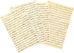 Belles lettres d’amour fou à Katia, avec cinq lettres d’elle. Cet ensemble regroupe cinq lettres de la correspondance amoureuse du Tsar Alexandre II à Catherine (Katia) DOLGOROUKI (1847-1922), témoins de cette extraordinaire histoire d’amour. Leur liaison débuta en 1866. Elle avait dix-huit ans, lui quarante-sept. En 1870, l’installation de Katia dans une chambre du Palais d’Hiver, au-dessus des appartements impériaux où résidait la Tsarine Marie Alexandrovna, fit un énorme scandale à la Cour. En 1872, elle lui donnait un fils, Georges, puis deux filles, Olga et Catherine. La Tsarine, depuis longtemps souffrante, mourut le 3 juin 1880, et quarante jours seulement après sa disparition, Alexandre fit de Catherine son épouse morganatique, lui conférant le titre de Princesse Yurievskaya. La vie légitime du couple fut de courte durée, car le Tsar fut victime d’un attentat à la bombe le 13 mars 1881. Ramené mortellement blessé au palais, il agonisait quelques heures plus tard dans les bras de Katia. Devenue veuve, la princesse Yurievskaya s’exila en France à Nice, où elle mourut en 1922, emportant avec elle sa précieuse correspondance que le nouveau Tsar Alexandre III avait tenté de récupérer pour la détruire. Les lettres sont numérotées, et portent la date et l’heure, comme un journal de conversation. Elles sont rédigées principalement en français, avec quelques phrases en russe généralement dans l’alphabet latin, et un vocabulaire secret (comme les bingerles désignant leurs ébats érotiques). Par mesure de sécurité, elles ne comportent pas le nom de Catherine et ne sont pas signées. La formule finale en russe : « мвойн на всегда » (à toi pour toujours), tient lieu de signature. En tête des lettres de Katia, Alexandre II a inscrit la date de réception.