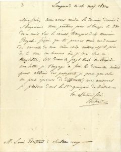 Émouvante lettre après la mort de Napoléon. « Mon frère, nous avons rendu les derniers devoirs à l’Empereur. Nous partons pour l’Europe le 23 de ce mois sur le Camel, transport de la Marine Royale. J’espère que tu pourras venir me donner des nouvelles de ma mère et des nôtres, et je te prie de te venir me trouver où je serai soit en Angleterre, soit dans les Pays Bas. Au reçu de ma lettre je t’engage à faire les démarches […] pour obtenir des passeports. Je pense que cela ne peut éprouver de difficulté ; nous arriverons je présume dans la 1ère quinzaine de juillet »…