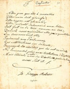 Très rare et curieux poème subversif contre Louis XVI et Marie-Antoinette. Ce poème subversif est une parodie de la prière du Notre Père. Cagliostro signa ce document, trouvé dans ses papiers saisis à Rome, lors du procès de l’Inquisition, quand Cagliostro finit par avouer qu’il était Balsamo.
