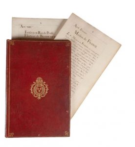 Superbe manuscrit de cour calligraphié dans une reliure aux armes royales, avec 63 tables généalogiques, pour déterminer les degrés de parenté de Louis XV avec les différents souverains, princes et princesses d’Europe . Ce manuscrit royal est remarquable par son sujet. Rédigé en 1772, soit deux ans avant la mort de Louis XV, il témoigne des pratiques d’une étiquette de cour. Dans la perspective de sa mort, Louis XV, qui en 1772 était encore en parfaite santé, demanda à Clairambault,