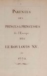 généalogiste des ordres du Roi – dont les bureaux se trouvaient dans le château de Versailles –, s’il pouvait déterminer la légitimité de tel ou tel prince étranger à porter le deuil du Roi, et inversement. Clairambault composa pour son roi un magnifique et rare tableau généalogique transversal. On voit ainsi se déployer devant nous la parentèle de Louis XV. On découvre ses cousins, et par là même son sang si mêlé à toutes les Maisons de l’Europe d’alors. Chaque prince contemporain du Roi Louis XV se voit, par de remarquables tableaux, attribué un degré de parenté. La Bibliothèque nationale de France conserve dans le fonds Clairambault un manuscrit similaire, mais incomplet. Le duc de Luynes fait allusion dans ses Mémoires à ce manuscrit : « Voici la parenté du Roy, copiée sur l’état que Monsieur de Clairambault a fait pour le Roi, de sa parenté avec tous les souverains de l’Europe, assez proches pour en porter le deuil » (t. XVI, p. 150 n.1). Ce manuscrit, réglé au crayon et soigneusement calligraphié, se compose d’une « Table alphabétique des Noms compris dans ce Volume », et de 19 « articles » illustrés de tables généalogiques : « Maison de France » et sa suite : « Maison des Rois de Portugal » ; « Joseph II de Lorraine, Empereur » ; « Marie-Théreze d’Autriche, Impératrice-Reine » ; « Georges III de Brunswick, Roi d’Angleterre, Electeur d’Hanovre » ; « Le Prince Charles Edouard [Stuart] et le Cardinal d’Yorck » ; « Le Roi de Dannemarck, le Roi de Suède, le Grand Duc de Russie et les autres princes de la Maison d’Oldenbourg-Holstein » ; « Sophie-Auguste-Frédérique d’Anhalt-Zerbst, Impératrice de Russie »,