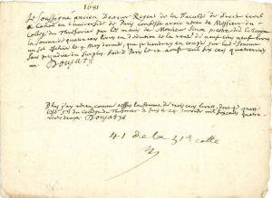 Rares quittances autographes de l’historien et du juriste. 31 décembre 1655. Doujat, « Historiographe du Roy pour escrire l’Histoire de Sa Majté en latin », reçoit 600 livres pour les deux premiers quartiers des gages attribués à sa charge… 12 août 1681 et 24 janvier 1682. Quittances comme « ancien Docteur Regent de la Faculté de droit civil et canon en l’université de Paris » pour des sommes reçues en déduction de sa rente…