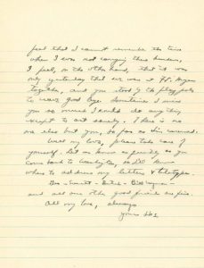 Belle et longue lettre affectueuse à sa femme, quatre semaines après le débarquement de Normandie. Il parle de leur fils John, qui a été diplômé de l’école militaire de West Point le jour même du Débarquement, et évoque l’anniversaire de leur mariage (1er juillet 1916). Il confie cette lettre à George ALLEN ; il présume que Mamie se trouve à Fort Benning…Johnny lui manque ! Tout en ayant envie de le voir, il ignorait combien il appréciait de l’avoir à ses côtés, jusqu’à ce qu’il parte. Johnny aurait beaucoup aimé l’accompagner, ces derniers jours ; parti de Londres le lendemain du départ de John, Ike a traversé beaucoup de pluie et de boue, et vu beaucoup, beaucoup de troupes. Il est très content que tant d’officiers aient vu Johnny, certains pour lui parler un peu. Presque tout le monde arrive et se concilie aussitôt les bonnes grâces d’Ike en louant son « admirable fils », etc. Il a reçu son message adorable le 1er juillet, mais elle ne fait aucune mention des fleurs : il s’était arrangé pour qu’elle en ait. Cependant son message l’a ragaillardi. Si seulement cette guerre pouvait être terminée avant leur prochain anniversaire (la guerre européenne, s’entend), ils seront certainement ensemble, dût-il s’absenter sans permission… Il évoque une accumulation de petites tâches due à l’absence de personnel de bureau, une affaire entre son frère Milton et Jack Connolly... Tata a dû être déçue de rater la remise de diplômes de John ! Ike pense que ce fut une bénédiction, pour John, que Mike finît par produire des enfants, faute de quoi John eût ressenti un tel fardeau de responsabilité en assumant, seul, les espoirs d’une famille entière, qu’il se serait enfui vers une île des Mers du Sud !! Sans doute que John a donné une bonne image de leur manière de vivre. D’une certaine manière, c’est une existence très ordinaire, mais comme il n’y a jamais de moment sans stress ou sans problème, le temps passe vite, et on se demande où il est parti… Souvent il redoute de se rappeler une époque où il ne portait pas tous ces fardeaux, mais d’un autre côté, c’est seulement hier qu’ils étaient ensemble au Fort Myer, et qu’elle s’est tenue près du mât porte-drapeau pour lui faire signe d’adieu. Parfois elle lui manque tant, il pourrait tout faire, sauf agir lucidement. Il n’y a qu’elle, en ce qui le concerne… Leurs bons amis, dont le général Smith, Butch et Bill Wyman vont bien… Il termine par l’expression de sa tendresse… « How I miss Johnny. While I was keen to see him, I didn’t know just how much I appreciated having him by my side until he was gone. He would have thoroughly enjoyed goin g with me these last few days. I left here the day after he did - and I’ve ploughed through rain and mud and seen lots and lots of troops. I’m so glad that lots of the officers around here got to see him some to talk to him a while. Almost everyone that cornes in gets on my good side right away by saying ‘what a fine son’ […] «Unquestionably he [John] has given you a good picture of how we live. In some ways it is a most hum-drum existence, but since there is never a moment that doesn’t have its strain or particular problem, the time rushes by and you wonder where it has gone. While I often feel that I cannot remember the time when I was not carrying these burden, I feel, on the other hand, that it was only yesterday that we were at Ft. Myer together, and you stood by the flagpole to wave good-bye. Sometimes I miss you so much I could do anything except to act sanely. There is no one else but you, so far as I’m concerned »…
