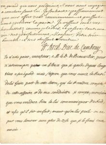 L.S. « Fr. Arch. Duc de Cambray » avec post-scriptum autographe, Cambrai 25 février 1699, [à Michel CHAMILLART] ; 7 pages in-4 (dont ¾ autographe).