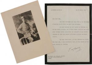 10 avril 1948, sur la collection des « Classiques de l’art militaire » aux Éditions Berger-Levrault. Les deux ouvrages que son ami a eu la délicate attention de lui offrir lui sont bien parvenus. « Je suis heureux de voir enfin se réaliser un de nos vieux projets. Nul n’était mieux qualifié que vous pour diriger cette collection qui manquait à nos bibliothèques et dont les jeunes officiers tireront un grand profit »… 13 avril 1949. « J’ai lu le Marmont que je vous remercie de m’avoir adressé et dédicacé et j’ai été vivement intéressé par les commentaires que vous y avez insérés. Je vous suis très reconnaissant aussi d’avoir bien voulu accepter d’indiquer au Général CHASSIN les passages de mes livres qui pourraient figurer dans l’anthologie qu’il prépare »… 15 avril 1949. « Conformément à l’Instruction sur l’organisation du Rassemblement du peuple français du 13 Novembre 1947, je vous ai désigné comme membre du Conseil National. Je suis heureux de vous le notifier et de vous inviter à prendre part à la session du Conseil qui se tiendra à Paris du 20 au 22 Mai 1949 »… On joint une photographie de De Gaulle (vers 1914-1915, retirage).