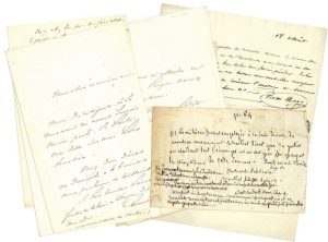 Bel ensemble de lettres d’écrivains adressées au rédacteur du journal légitimiste. Jacques ANCELOT (2), Virginie ANCELOT (6), François-Guillaume ANDRIEUX, Alfred ARAGO, Charles-Victor vicomte d’ARLINCOURT (9), Jean-Alexis chevalier ARTAUD de Montor (2), Joseph AUTRAN (poème La Neige au cimetière), Prosper de BARANTE, Jean-Nicolas BARBA (4), Roger de BEAUVOIR (2, dont une réclame à insérer dans la Gazette), Anne BIGNAN, Casimir BONJOUR, Hippolyte BONNELLIER, Mathurin-Joseph BRISSET, Jean-Baptiste CAPEFIGUE (5), FrançoisRené de CHATEAUBRIAND (note autogr.), P. CHRISTIAN [Christian Pitois] (10), Albert CLER, Louis de CORMENIN (2), Marcellin DEBRUN, Frédéric DEGEORGE, Antoni DESCHAMPS (quatrain), Émile DESCHAMPS, Charles DIDIER, Frédéric DOLLÉ, chevalier DUVALLIER, Émile FORGUES (« Old Nick »), A. de GARAUDÉ, Eugène de GENOUDE (50), Francis GÉRAULT (épître à Lamartine), Léopold de GAILLARD, Stanislas GODEFROY, Ivan GOLOVINE, Alexandre GUIRAUD (4), Victor HUGO, Eugène JANVIER, Adolphe JOLLIVET (2), Paul de JULVÉCOURT, Alphonse de LAMARTINE (15 dont une incomplète, plus une écrite en son nom par Madame), Pierre LAURENTIE (2), Léopold LECLANCHÉ, Ernest LEGOUVÉ, Honoré de LOURDOUEIX (9), comte de MARCELLUS (2, dont une paraphrase en forme d’ode du Psaume 144), Édouard MENNECHET (2), Jean-Toussaint MERLE (2), François MOIGNO (2), Louis MONMERQUÉ, FrançoisDominique comte de MONTLOSIER (4, dont ms d’article sur le parti royaliste), Alfred NETTEMENT (2), NICOLET, Charles de NUGENT (poème Sœur Anne), Ernestine PANCKOUCKE (4), Silvio PELLICO, Eugène de PLANARD, François PONSARD (2, dont un ms extrait de Lucrèce), Jean-Joseph POUJOULAT, Évariste REDON, François ROGER (6), Auguste SIMON (au sujet de Chateaubriand), Charles-Augustin SAINTEBEUVE, Jules SANDEAU, Eugène SCRIBE, etc.