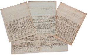 Belles lettres d’amour et d’érotisme du célèbre écrivain gastronome à sa maîtresse. [Grimod a fait connaissance en 1790 à Lyon, où il avait ouvert un magasin d’alimentation et d’étoffes, d’une charmante comédienne, Adélaïde-Thérèse FEUCHÈRE (1764-1845), qui deviendra vite sa maîtresse et lui donnera une fille (morte en 1793) ; il l’épousera en 1812. Il lui écrit ces longues et savoureuses lettres dans son étonnant graphisme dû à la malformation de sa main.] 17 septembre 1790. Il restera encore à Béziers chez sa tante, mais il assure n’être « arreté par aucune séduction, illusion, ou plaisir », et il tiendra parole de rentrer à Lyon pour les couches de sa « charmante amie ». Il lui donne le détail de ses voyages… « Qui m’obligeoit à te dire que je voulois être non le parrain, mais le père légal de ton enfant, tandis que toi-même n’osois m’en prier ? Connois mieux un cœur qui ne respire que pour toi, qui ne vit que pour t’aimer, et qui s’ouvre délicieusement à tous les sentimens de la nature. Ce que je desirois le plus au monde c’etoit d’avoir un enfant d’une femme que j’aimai. Tu as rempli ce vœu. C’est maintenant à moi à remplir tous les devoirs qu’il m’impose. […] Je les remplirai avec amour, avec exactitude, dans toute leur étendue, en adoptant cet enfant, en m’en déclarant le père »… Ne voulant point porter « les chaînes du mariage », il ne peut mieux faire que de vénérer celles que lui impose la « créature angélique » qu’il idolâtre : « ô ma Feuchere ! Rends enfin justice à ton amant ! Connois le mieux, et crois qu’il t’aime de toutes les forces de son ame, et de toute l’energie de ses sens. Brulante ivresse qui s’empare de moi chaque fois que je repose mon ame sur le souvenir de ma bien aimée, soyez garante de mon amour. Daignés y croire enfin, petite mignone ; que ne puis-je en ce moment te serrer dans mes bras, confondre mon existence avec la tienne, m’inonder d’un torrent de delices sur ton sein palpitant de plaisir et d’amour, et mourir de l’excès de volupté puisé dans ton cœur et dans tes sens »… Ayant baisé le « gage chéri » qu’elle a joint à sa lettre, il s’enflamme : « Combien ma bouche ivre de plaisir et haletante des feux du désir, s’est desalterée delicieusement à cette fontaine de cristal, qui coule entre vos trumeaux enlacés. Que ma lampe tremblante aimoit à s’insinuer jusqu’au fond de cette source adorable, à en pomper l’eau divine, à en provoquer l’écoulement ; et alors dans quels vases de voluptés tout mon être se plongeoit. Delicieuses sensations qui redoubloient en moi le prix de l’existence n’allez vous pas bientôt renaître pour me faire encore mille fois mourir de plaisir, et me ranimer pour mourir encore »… Il l’entretient enfin du choix d’un parrain, M. Bonnet, et d’une marraine, Mme Colletta… Il va lui envoyer d’excellents raisins muscats, des fromages, du miel… 8 avril 1791. Il la gronde tendrement au sujet de sa santé ; il attache le