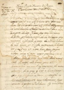 Recommandations du Roi de Navarre à Catherine de Médicis et Henri III, pour rétablir la paix dans la France ravagée par les guerres de religion . « Madame Je vous suplye tres humblemant avoyr egard a ce que je vous ecry [...] & croyre quil est besoin dy pourvoyr sy vous desyres establyr une bonne paix antre les sugects du roy. Je fay tous les jours de belles promesses a ceus de la religyon quy viennent a plainte a moy & les assure de vre bonne et droyte intantion a la paix & que le roy & vous leur feres fayre justice, mays il faut voyr quelques efects. Le desyr que je scay que tous deus vous aves de voyr une bonne paix & de lantretenyr me rand sy soigneus de vous advertyr de ce quy sert a lantretenyr & ce quy la peut alterer & rompre. Ce demantelemant a este imprudemmant fayt & mal a propos, il est besoin dy remedier quelque chose quon vous mande. Letablysemant de la paix pouvoyt plus aporter de bien que le demantelemant, souvant an pansant fayre chose quy serve il arivent quelle nuyst infinyemant. Mais je laisseray ce propos pour vous parler de mon partyculier, & vous dyre que mes gens ne peuvent avoyr a la court aucune espedytion pour moy, jy suys tellement favoryse quil ny an a un seul quy ne soyt mieus trayte que moy. Je nay peu ancores avoyr assignatyon de ma pansyon elle est d’autre qualite que les autres, elle est baillee an consyderation de la perte de mon royaume pour le servyce de ceste couronne »…