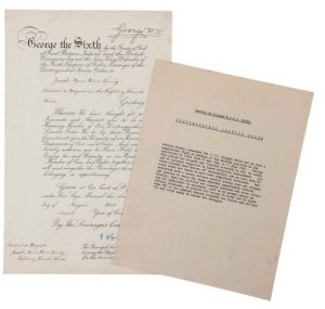 Distinguished Service Order (DSO), fondé par l’Empire britannique le 6 septembre 1886. Médaille en or jaune (750), argent doré (min. 800) et émaux polychromes. Barrette gravée au revers 1942. Poids brut : 35,7 g. Très bon état. Dans son écrin de la Maison GARRARD. Avec le Diplôme signé par le roi George VI, et donné au général Joseph Marie KOENIG, Général de Brigade, Fighting French Forces, août 1942. Cette décoration est l’une des plus prestigieuses décernées par l’Empire Britannique.