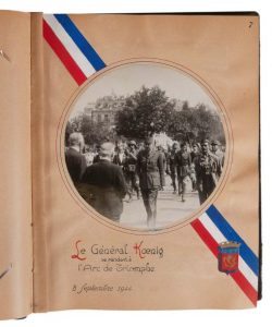 ALBUM du Service “Photo” de l’État-major du Général Kœnig, 1944 ; 108 photographies ou découpes de photographies montées dans un album in-fol., légendes manuscrites et quelques ornements à la gouache, plus 15 photos non montées, reliure cartonnée demitoile noire, titre manuscrit sur le plat sup. avec le drapeau du gouverneur militaire de Paris peint à la gouache.