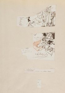 DESSINS originaux et NOTES autographes ; 4 fragments découpés dans un feuillet de papier vergé, postérieurement montés sur un feuillet in-fol.