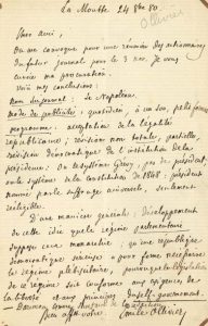 Charmante correspondance de 5 lettres à sa chère « petite amie », où il est question d’Heine, Lamartine, un dîner chez Girardin avec le Prince, le consul de Prusse, Nigra, La Guéronnière et Cabarrus, aussi bien que de Cosima von Bülow (« Elle me néglige. Elle n’a probablement pas de temps au milieu de ses histoires avec le roi de Bavière et Wagner ») et Daniel Ollivier (23 octobre 1866 et s.d.)… – 27 janvier 1867, à Fouché, avec un rectificatif à insérer démentant son rôle « dans les derniers remaniements ministériels »… 20