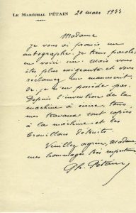 Antibes 29 septembre 1927, à un ami : « Votre appréciation sur le discours de Douaumont me flatte beaucoup, mais j’espère qu’elle ne sera pas partagée par l’Académie française qui se doit à elle-même de ne pas se recruter exclusivement parmi les militaires »… 20 mars 1933, à Mme Robert Brussel, lui adressant un autographe : « Mais vous êtes plus exigeante, et vous réclamez un manuscrit. Or, je n’en possède pas. Depuis l’invention de la machine à écrire, tous mes travaux sont copiés à la machine et les brouillons détruits »…
