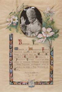 Bénédiction donnée à Giuseppe et Antonietta Quaglia à l’occasion de leurs noces d’or, sous la photographie du Pape bénissant. Riches décorations florales en couleurs et or, le portrait entouré de roses peintes ; au bas, les armoiries papales peintes
