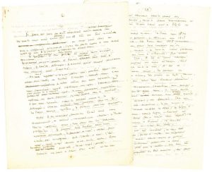 Appel inédit aux Français où Saint-Exupéry rappelle son propre engagement de pilote dans la guerre, et appelle les Français de l’étranger à s’unir contre l’ennemi. [Saint-Exupéry, exilé aux États-Unis, se trouve dans une situation délicate : il ne veut pas choisir entre Vichy et De Gaulle, tout en voulant combattre le nazisme et l’Allemagne d’Hitler. Choisir De Gaulle est difficile pour lui, alors que le général n’est pas reconnu par le gouvernement américain. Après l’occupation de la « zone libre » le 11 novembre 1942, voulant alors rassembler les Français vivant aux U.S.A. et convaincre l’Amérique d’intervenir dans la guerre, il rédige un appel aux Français pour une allocution radiodiffusée le 29 novembre 1942 sur les postes américains émettant en langue française et largement reproduite dans la presse, recueillie dans Un sens à la vie, maintenant éditée sous le titre Lettre aux Français (Pléiade, t. II, p. 69-73) ; le présent manuscrit, inachevé ou dont la fin manque, pourrait se rattacher à une première version abandonnée.]