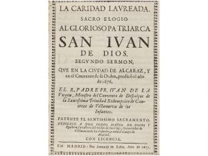 1677. (ALCARAZ - CONVENTO DE SAN JUAN DE DIOS). JUAN DE LA VIRGEN (TRINITARIO DESCALZO): LA CARIDAD LAUREADA. SACRO ELOGIO AL GLORIOSO PATRIARCA SAN JUAN DE DIOS. SEGUNDO SERMÓN, QUE EN LA CIUDAD DE ALCARAZ, Y EN EL CONVENTO DE SU ORDEN, PREDICÓ EL...