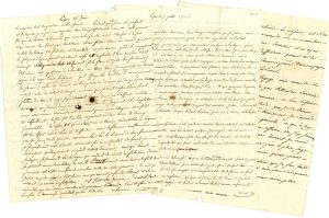 Important ensemble de lettres du maréchal Soult à sa femme, principalement pendant les campagnes de Pologne et d’Espagne. [Soult a épousé en 1796 Jeanne-Louise-Élisabeth BERG (1771-1852), qui lui donnera deux enfants : Napoléon-Hector (1802-1857) et JoséphineLouise-Hortense (1804-1862).] Dans ces lettres, dont nous ne pouvons donner ici qu’un rapide aperçu, Soult manifeste une grande affection pour sa femme et ses enfants Napoléon et Hortense, dont l’éducation l’intéresse vivement, et témoigne de beaucoup de confiance en Louise, qu’il charge de nombreuses commissions auprès d’agents d’affaires, avocats et entrepreneurs, ainsi que de démarches parfois délicates au ministère et à la Cour. Toute interruption dans leurs échanges le rend très malheureux : « Il me faut plus de courage pour supporter pareille peine que pour affronter sur un champ de bataille les dangers. Alors je cours seulement des chances » (Liebstadt 5 mai 1807). Les lettres sont écrites au fil des campagnes : Alexandrie (Italie) ; Passau (Bavière) ; en Pologne : Prausnitz, Willenberg, Liebstadt, Rosenau, Morangn, Elbing ; Königsberg (Prusse Orientale), Dantzig ; en Esapgne : Madrid, Mora, Almagro, Santa Cruz de Mudela, Baylen, Cordoue, Carmona, Séville, Puerto Santa Maria, Ronda, Malaga, Grenade, Xérès, Chiclana, Almansa, Piedrahita, Tolède ; Dresde en Saxe... 1800. La première lettre, datée d’Alexandrie (Italie), est écrite après que Soult fut blessé à l’attaque du Monte Creto, au nord-est de Gênes. Il paie enfin son « tribut à ce terrible dieu de la Guerre », qui jusqu’alors le traitait en « enfant gatté ». Soult fut emporté du champ de bataille par ordre de son frère, qui réclama des gardes à l’ennemi, « et le Lt Gal Prince d’HOHENZOLLERN, me fit panser en sa presance dans son logement » (2 prairial VIII/22 mai 1800)… 1806 voit Soult à Passau (Bavière), où il fait un récit de la bataille d’Austerlitz pour son fils. L’Empereur, « voyant que le dernier mouvement lui assuroit la victoire, et que ce qu’il restoit d’ennemis alloit être détruit, me dit, marechal Soult vous vous êtes couvert de gloire. J’avois une grande confiance dans l’armée de Boulogne aujourd’hui elle l’a justifiée et a surpassé toute attente. – Je repondis à Sa majesté […] que ma plus grande ambition avoit toujours été de combattre ses ennemis sous ses yeux pour meriter le suffrage du plus grand capitaine que le monde eut produit »… Transporté de bonheur, il balbutiait… Napoléon relève un point commun entre Austerlitz et Aboukir (16 juin)…