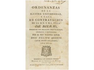 1796. (BILBAO). ORDENANZAS DE LA ILUSTRE UNIVERSIDAD Y CASA DE CONTRATACION DE LA M.N. Y M.L. VILLA DE BILBAO. Madrid: Imp. de Sancha, 1796. Folio. 2 h. + 370 p., 33 h. Papel algo tostado, puntos de óxido. Enc. en plena piel.