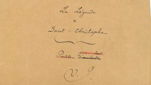Le livret, sous forme d’un carnet cousu (18,5 x 11,5 cm) de 40 pages remplies d’une minuscule et fine écriture au crayon, est intitulé Le Mystère de Saint-Christophe, avec la note : « première esquisse ». Il présente des ratures et corrections, avec d’importants passages biffés, et trois thèmes musicaux notés dans la marge et à la fin.
